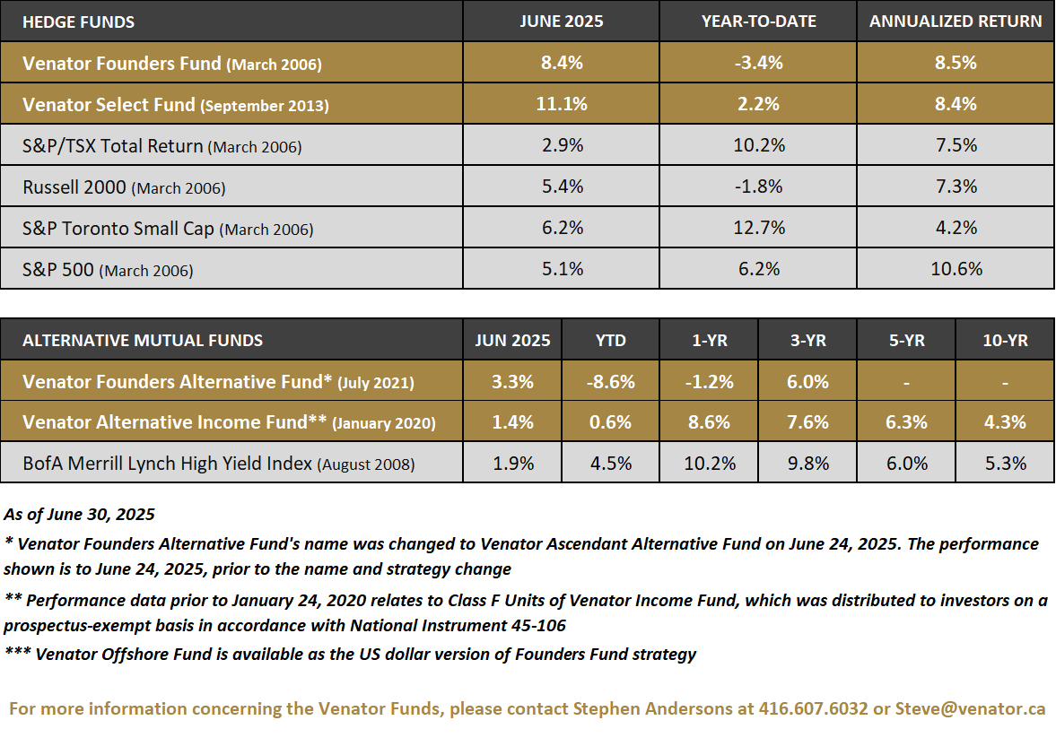 Commissions, trailing commissions, management fees and other expenses all may be associated with investing in any of the Venator Alternative Mutual Funds. Please read the prospectus and Fund Facts relating to each Alternative Mutual Fund before investing. The indicated rates of return of the Venator Alternative Mutual Funds are the historical annual compounded total returns, including changes in share or unit value and the reinvestment of all dividends or distributions, and do not take into account sales, redemption, distribution or optional charges or income taxes payable by any securityholder that would have reduced returns. Mutual funds are not guaranteed, their values change frequently, and past performance may not be repeated.