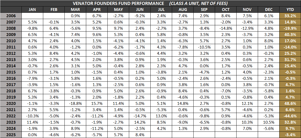 The Venator Hedge Funds may only be purchased by accredited investors with a medium-to-high risk tolerance seeking long-term capital gains. Please read the Offering Memorandum for each Hedge Fund in full before making any investment decisions. Prospective investors should inform themselves as to the legal requirements for the purchase of securities. All stated Venator Hedge Fund returns are net of fees. It is important to note that past performance should not be taken as an indicator of future performance.