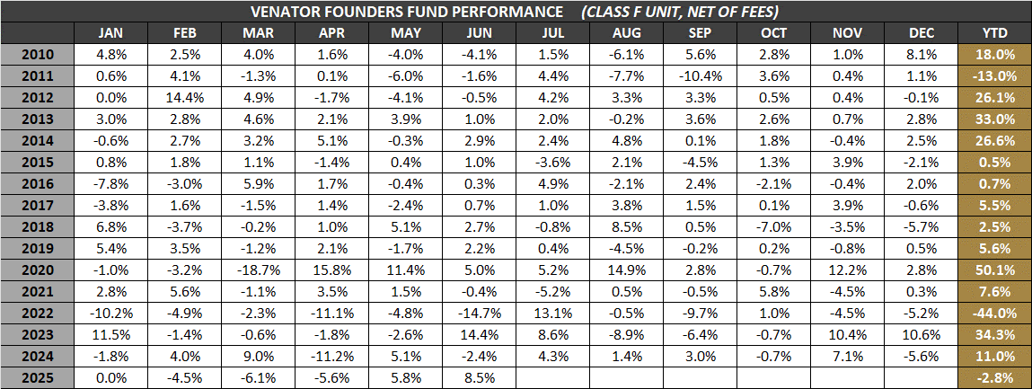 VENATOR FOUNDERS FUND is a North American long/short equity strategy which strives to capitalize on exceptional investment opportunities. The Fund focuses on business fundamentals with a bottom-up investment approach in order to identify high growth companies that are undiscovered (or unappreciated) by the market; as well as out of favour companies trading at low valuations that do not reflect ‘hidden assets’, intermediate business prospects, reversing business trends, or changing managerial philosophies.
