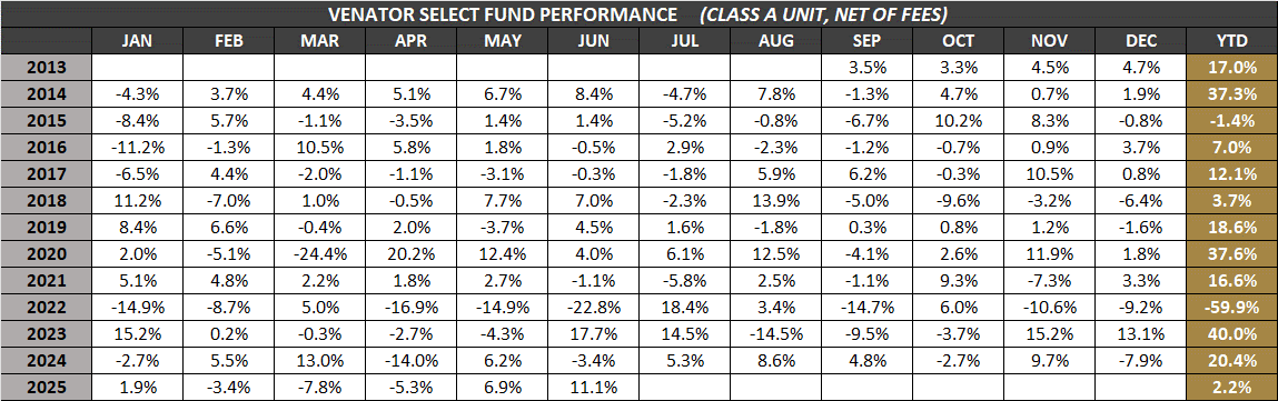 The Venator Hedge Funds may only be purchased by accredited investors with a medium-to-high risk tolerance seeking long-term capital gains. Please read the Offering Memorandum for each Hedge Fund in full before making any investment decisions. Prospective investors should inform themselves as to the legal requirements for the purchase of securities. All stated Venator Hedge Fund returns are net of fees. It is important to note that past performance should not be taken as an indicator of future performance.