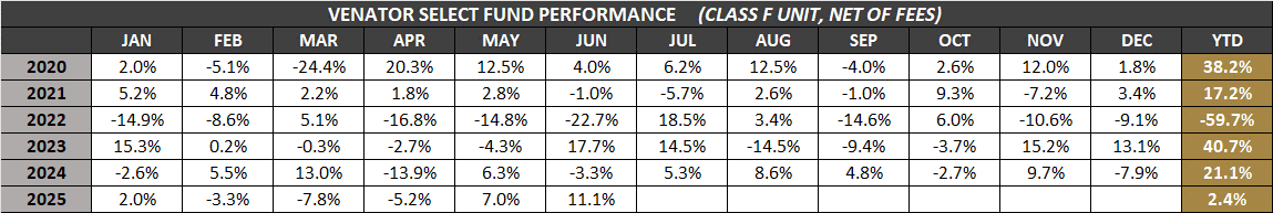 VENATOR SELECT FUND is a ‘best ideas’ strategy that strives to generate superior returns by concentrating investments in a small number of opportunities. The Fund can take both long & short investment positions in equity, debt, and derivative securities; as well as strategic trading in special situations. The allocation of long & short positions will vary depending on the opportunities that the Manager believes offer the best reward per unit of risk.